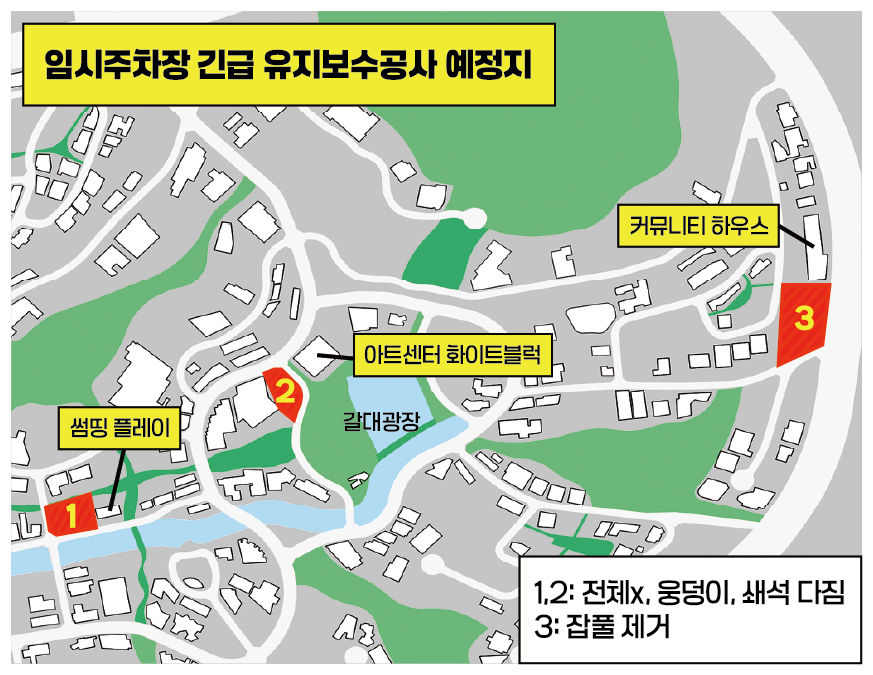 헤이리 마을 임시주차장에서 긴급 보수공사가 진행될 예정이오니 주민 여러분의 양해와 협조 부탁드립니다.